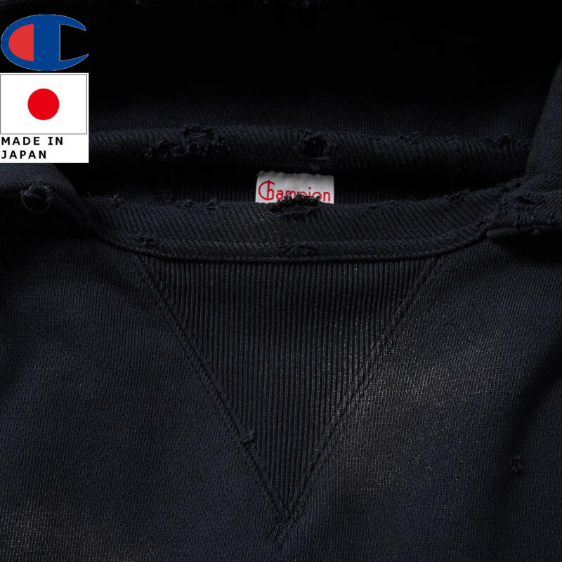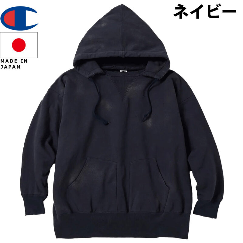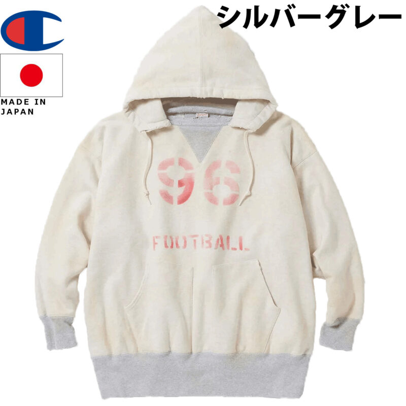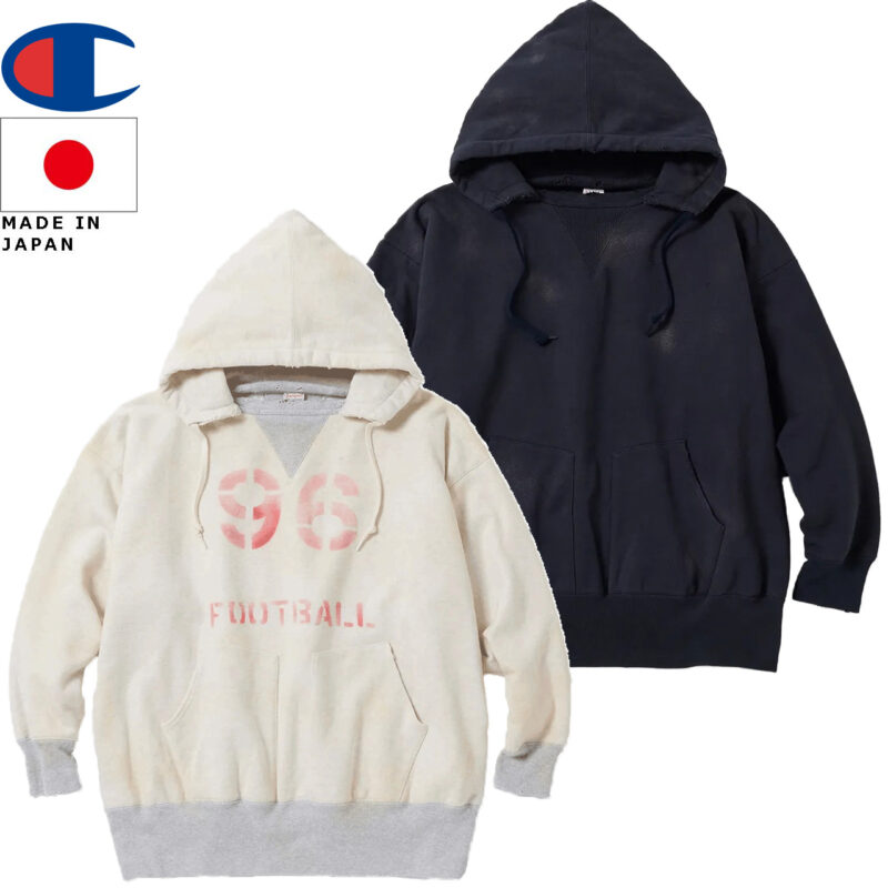1950年代半ばにアスレチックラインとして販売されたアイテムの復刻版。裏起毛素材を二重構造にしてかさを上げ、寒い季節にも対応する保温性を持たせたダブルシックネス プルオーバーアフターフーデッドスウェットシャツです。当時の生地を忠実に再現したコットン100%の生地を使用。脇接ぎのない丸胴仕様や筒状の袖リブ、襟のリブにフードを挟み込んだ通称「後付けパーカー」、前後の襟に入れた「GUSSET(ガゼット)」など、当時の仕様を再現しています。旧式のシンカー編み機で編み立てた独特のボリューム感と風合いが特徴です。ヴィンテージ加工によって、経年劣化した色合いや風合いを表現。プリントは実在のヴィンテージ商品のデザインを踏襲。シルバーグレーのボディには染み込みプリント、ネイビーのボディにはプラスチゾルプリントを使用しています。左袖にCロゴワッペンが付いていない点も当時の仕様そのままです。