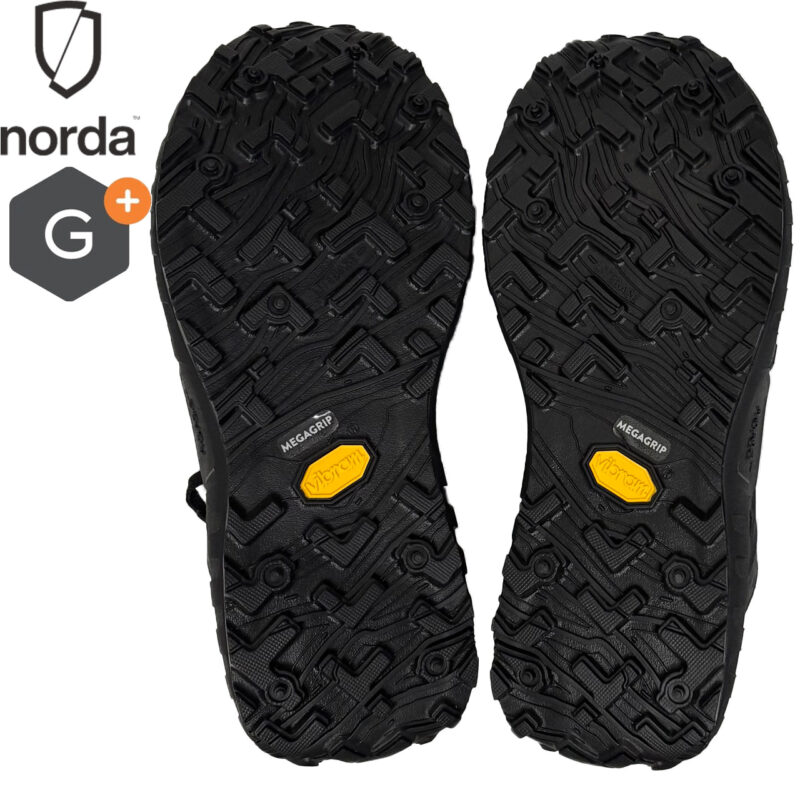 Vibram® Mega Grip® ラバーは、濡れた路面と乾いた路面の両方で優れた耐久性、トラクション、そして最強のグリップ力を発揮します。