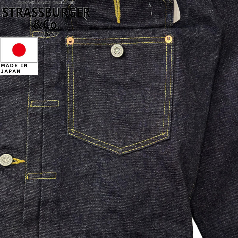 ゆったりとした特徴的なサイズ感の1stデニムジャケット。ヴィンテージモデル『SBJ-145-555』とセットアップで着用できるようバナナイエローのコアヤーン縫製糸で縫い上げました。ゆったりとしたサイズ感に仕上げることで、無骨さと着やすさを両立し、ワイドに近いSBJ-145-555のシルエットとも相性が良く、カッコよくセットアップでコーディネートいただけます。