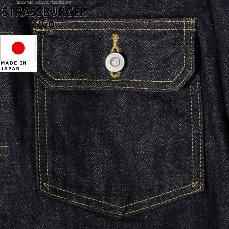 縫製糸には色落ちするバナナイエローのコアヤーンを採用。袖裏、見返し部分に赤耳セルビッチを使用。袖口と胸ポケットのフラップ下のポケット口にはリベット補強が施され荒々しい武骨な雰囲気を演出。背面にはシンチバッグがついたワークウェアテイストも持った一着。