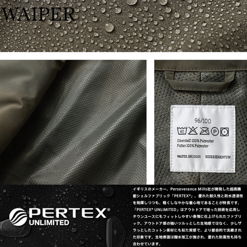 素材には、英国発の高機能ファブリック“PERTEX UNLIMITED(パーテックス・アンリミテッド)”を採用。